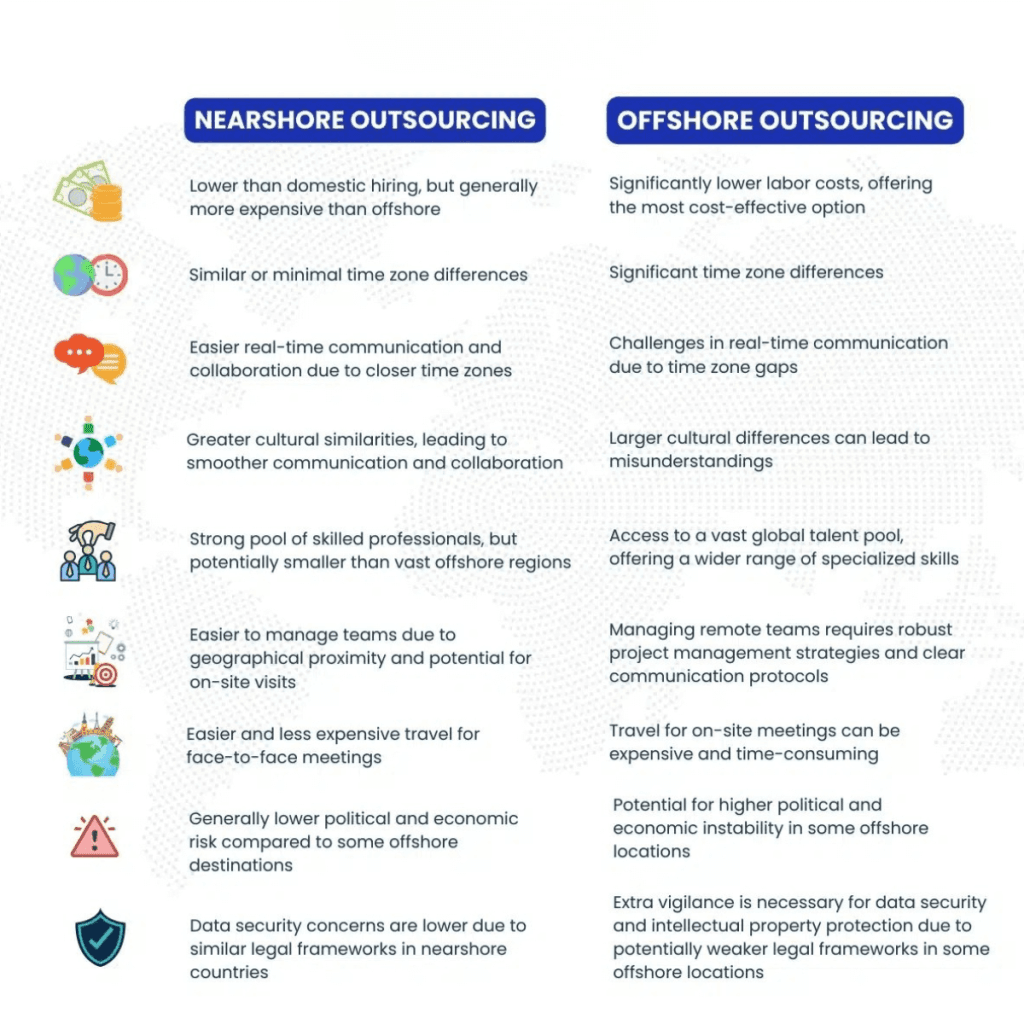 Offshore outsourcing, on the other hand, often involves teams in far-off regions like India or the Philippines.